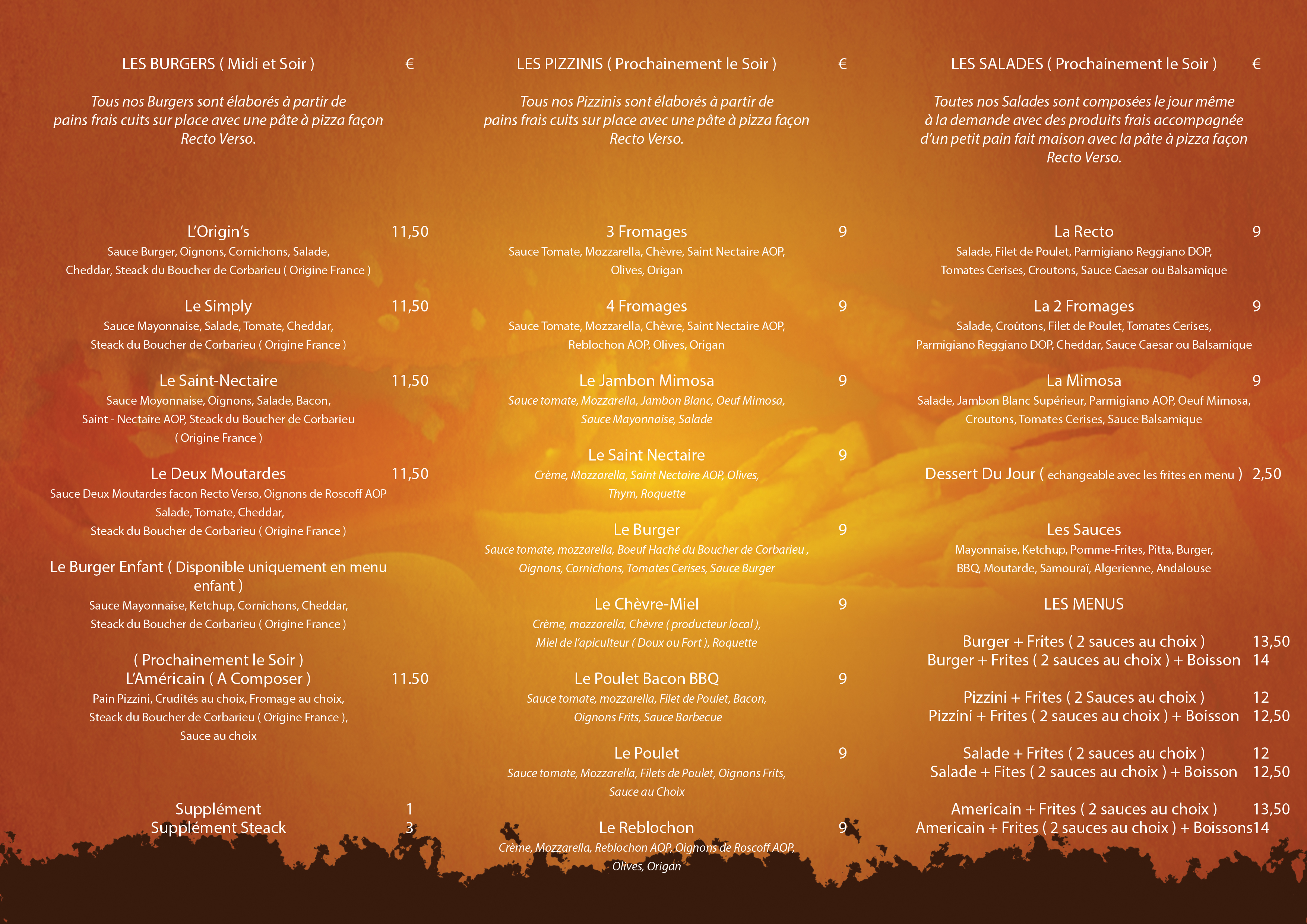 Choisissez le midi votre repas seul ou en formule accompagné d'un dessert, une boisson, des frites ou une salade verte ! Pizza, Pizzini, Burger, Salade, Dessert.... un large choix pour varier et pour tous les goûts !